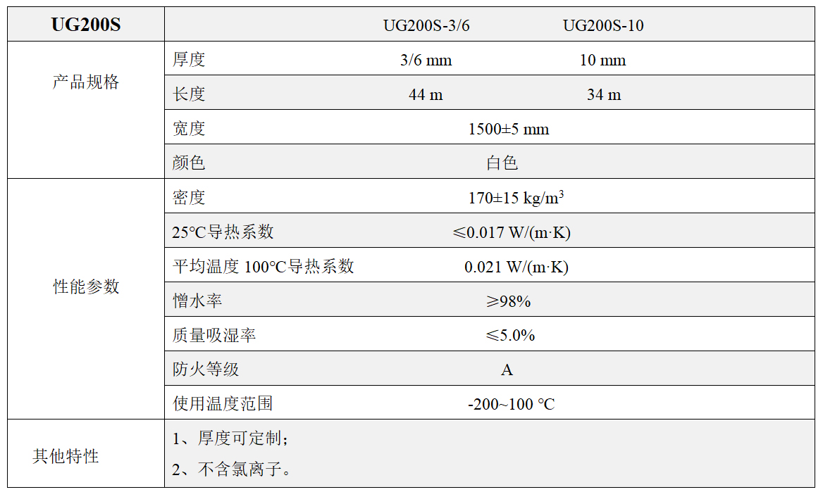 UG200S為超低導(dǎo)熱系數(shù)保冷型產(chǎn)品,推薦使用溫度為-200℃~100℃。主要應(yīng)用為保冷,推薦應(yīng)用領(lǐng)域?yàn)楸洹⒗鋷?kù)、LNG儲(chǔ)運(yùn)等。